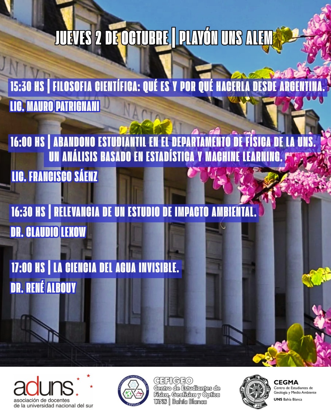 En Bahía Blanca , en el Playón Alem de la UNS, a partir de las 15:30 se realizarán 4 clases públicas (abiertas a todo público) organizadas por el CEFiGeO (Centro de Estudiantes de Física, Geofísica y Óptica – UNS) y el CEGMA (Centro de Estudiantes de Geología y Medio Ambiente – UNS).