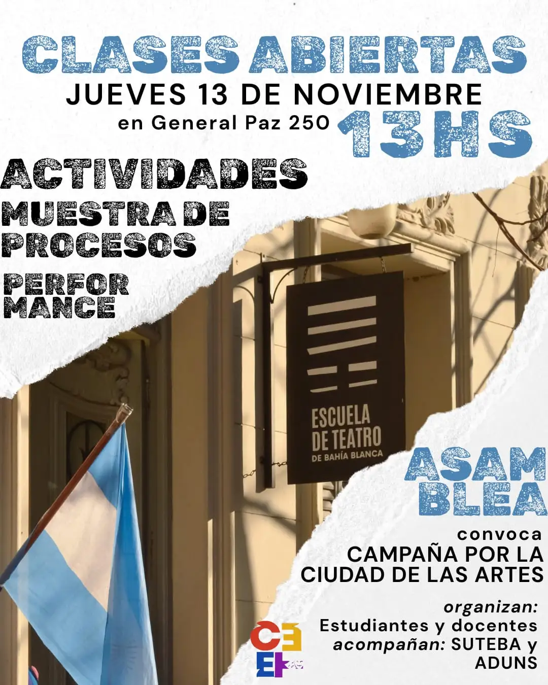 Jueves 13 de noviembre – ACTIVIDADES de MOVILIZACIÓN y VISIBILIZACIÓN junto al SUTEBA B. Bca. y otras organizaciones gremiales, estudiantiles, políticas y la ASAMBLEA por la CIUDAD de las ARTES.