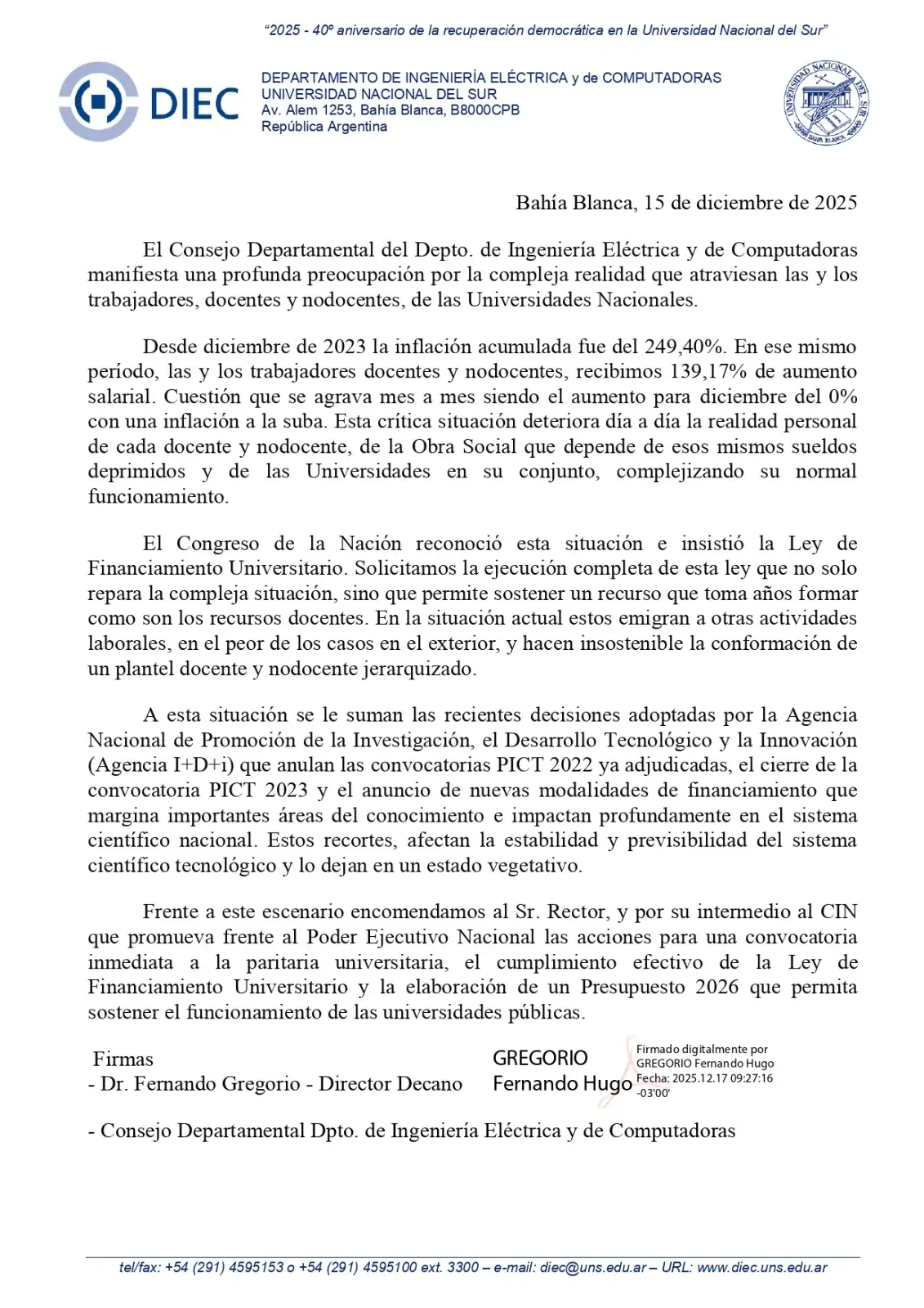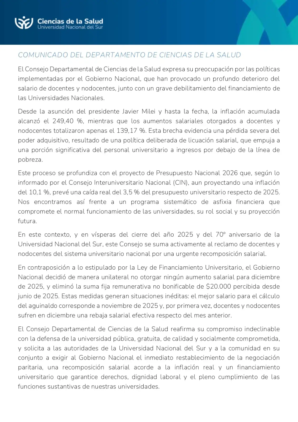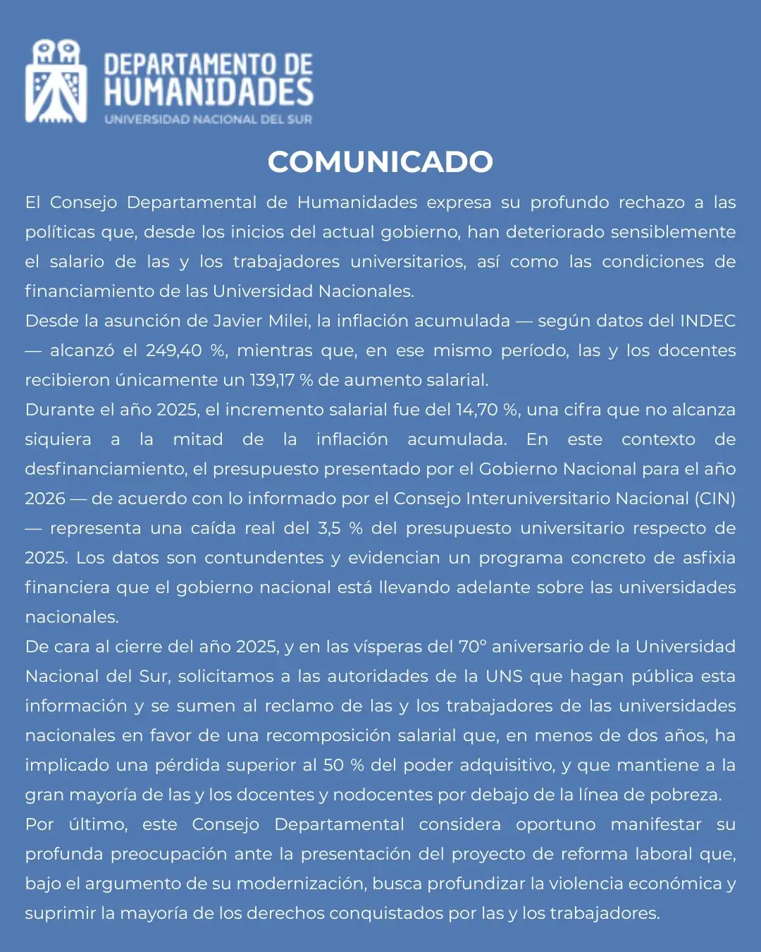 4 Departamentos Académicos de la UNS se manifestaron contra el brutal ajuste presupuestario y salarial, a favor del cumplimiento efectivo de la Ley de Financiamiento Universitario, por un presupuesto 2026 que satisfaga las demandas de la universidad pública y contra el proyecto de reforma laboral y educativa, entre otras cuestiones.