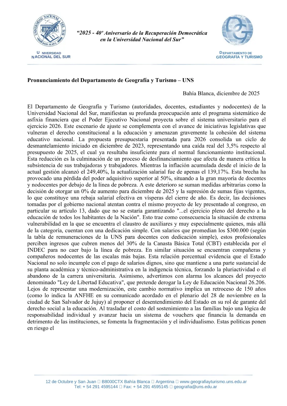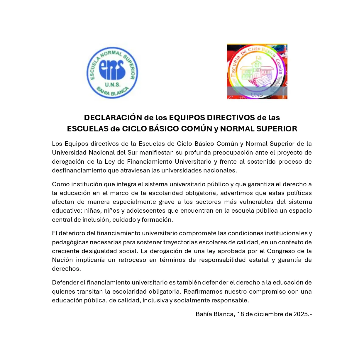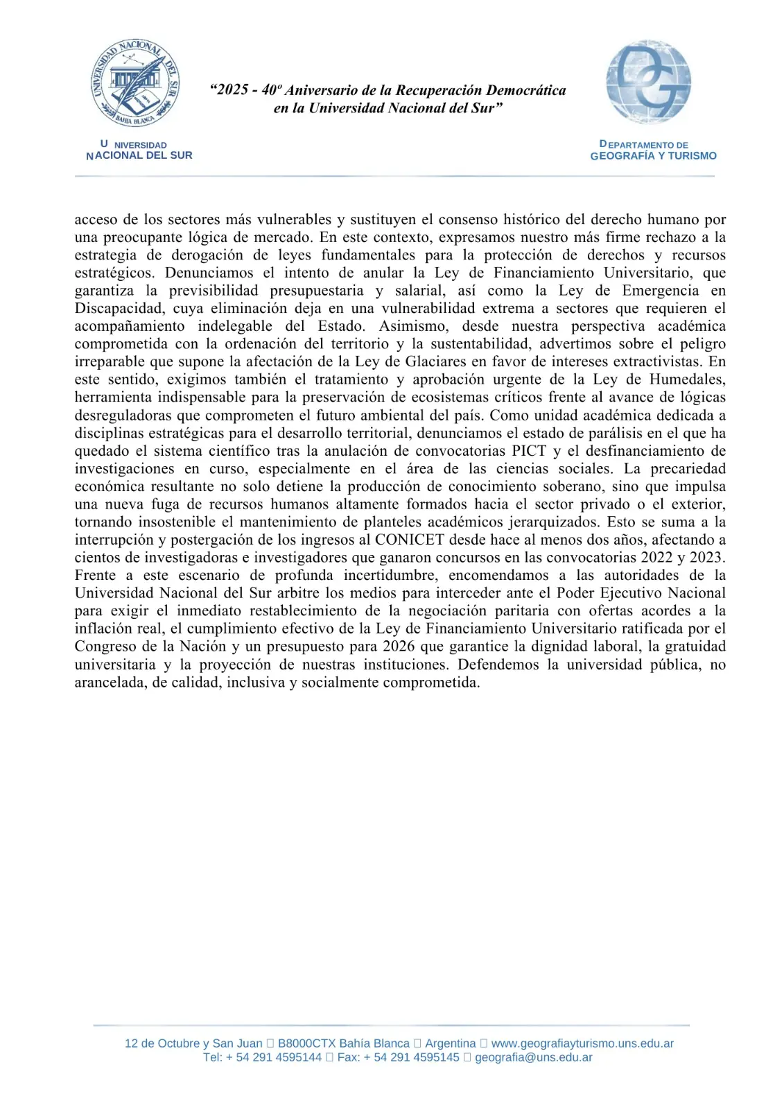 A los 4 anteriores: Cs. Educación + Cs. Salud + Humanidades + Ingeniería Eléctrica y de Computadoras se sumaron el Departamento de Geografía y Turismo, las Escuelas de Ciclo Básico Común y Normal Superior y el Consejo Superior Universitario de la UNS.