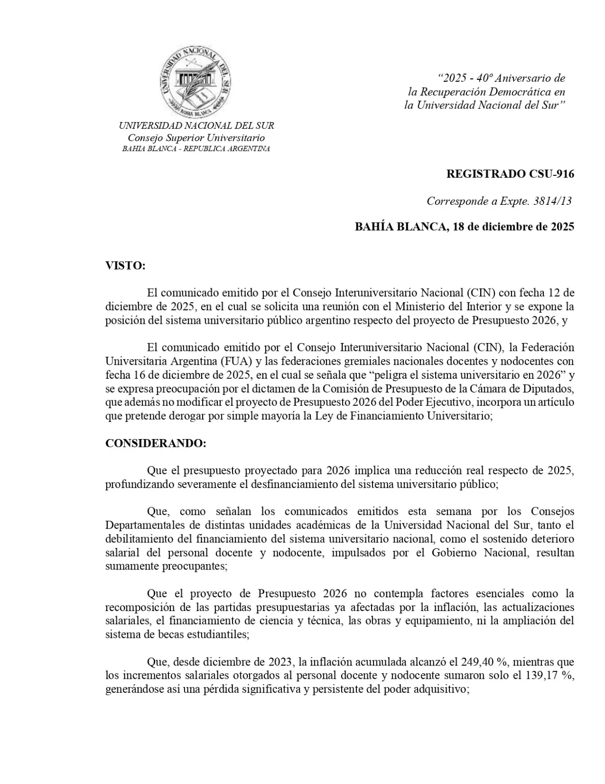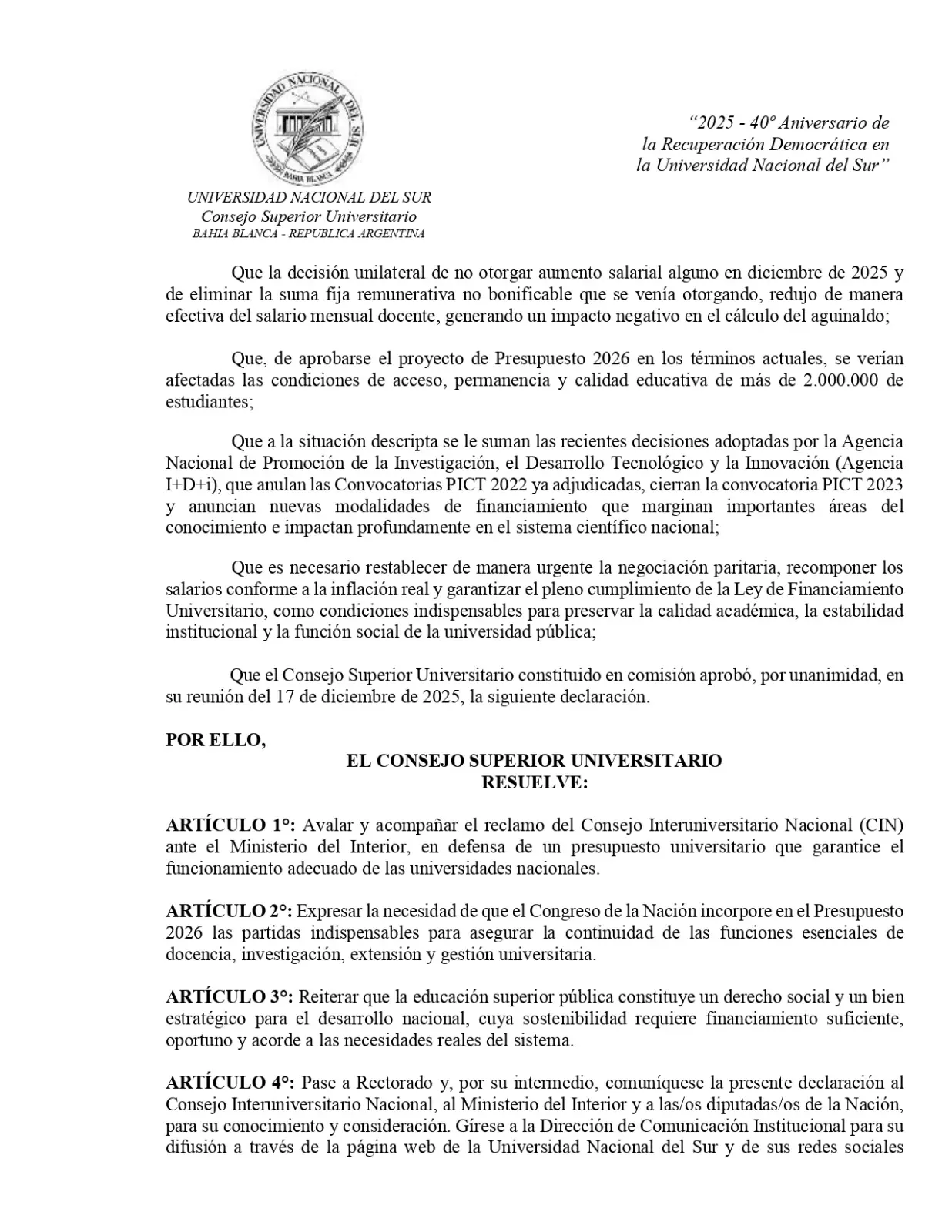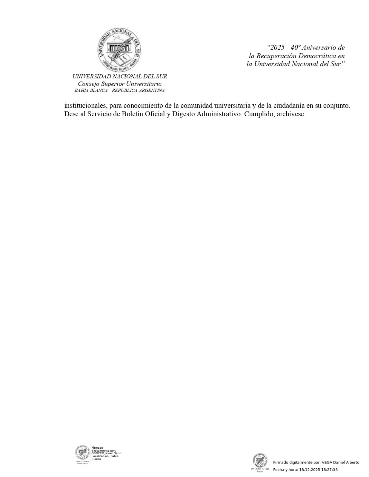 A los 4 anteriores: Cs. Educación + Cs. Salud + Humanidades + Ingeniería Eléctrica y de Computadoras se sumaron el Departamento de Geografía y Turismo, las Escuelas de Ciclo Básico Común y Normal Superior y el Consejo Superior Universitario de la UNS.