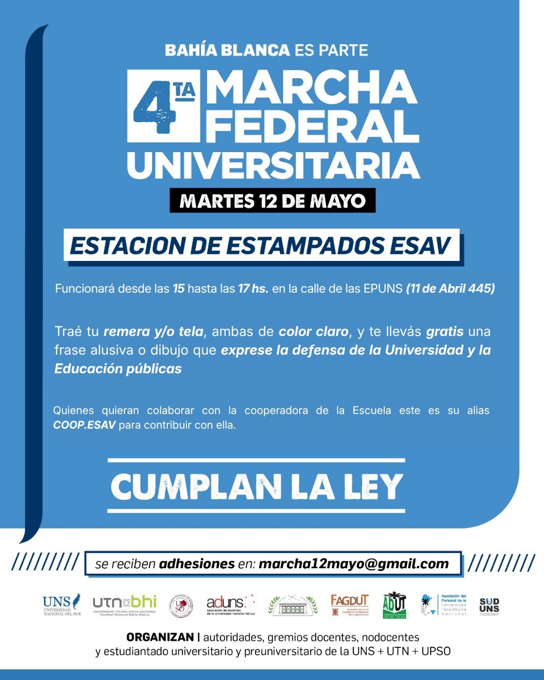 El martes 12 de mayo, en Bahía Blanca y en todo el país, tenemos un gran compromiso. Seremos millones inundando las calles de toda la república: Por la Universidad, por la Educación, por la Ciencia y Tecnología públicas y por todos los que están sufriendo las consecuencias del ajuste.