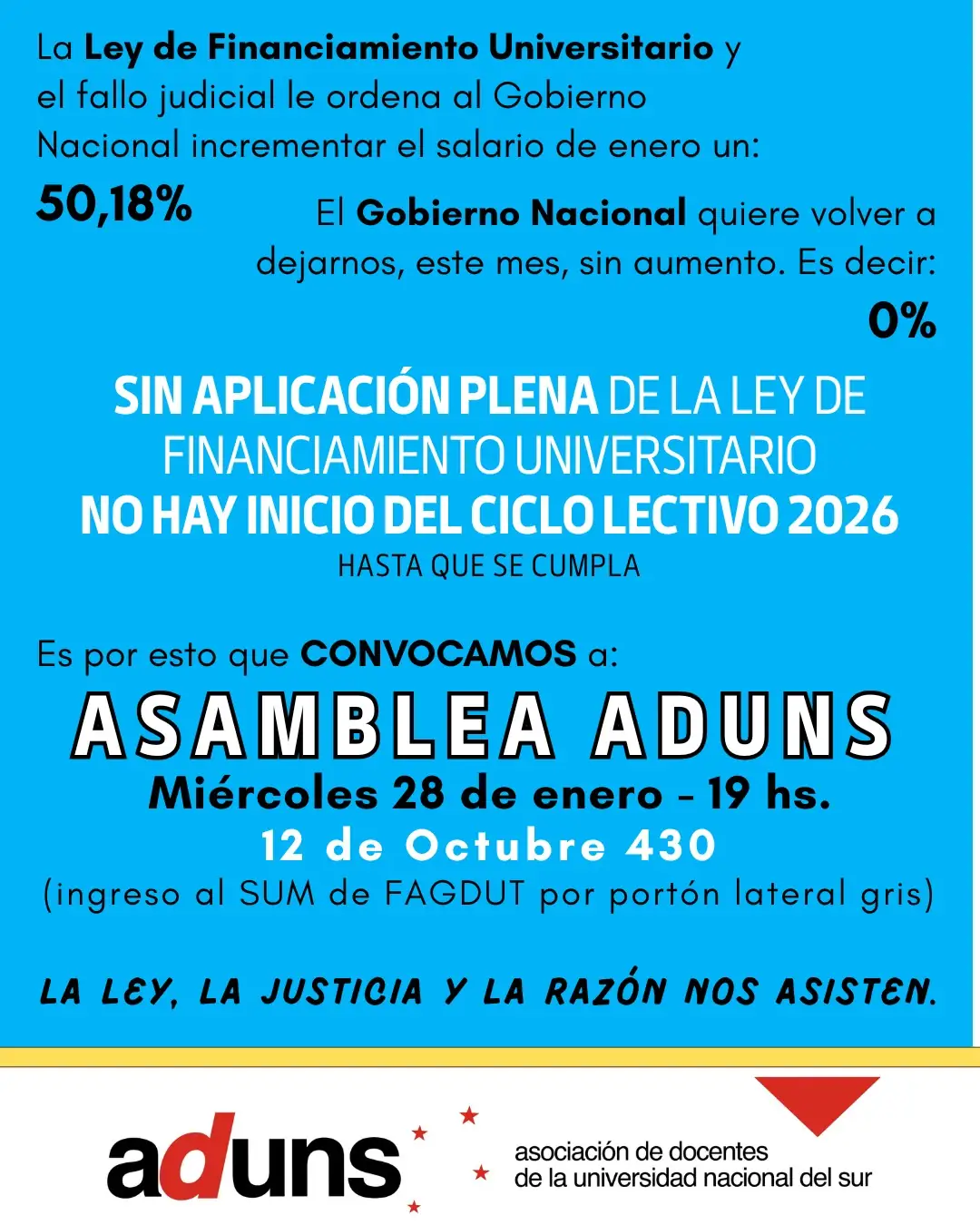 ASAMBLEA ADUNS 28 ENE – 19 hs – SUM FAGDUT. Sin Ley no hay inicio